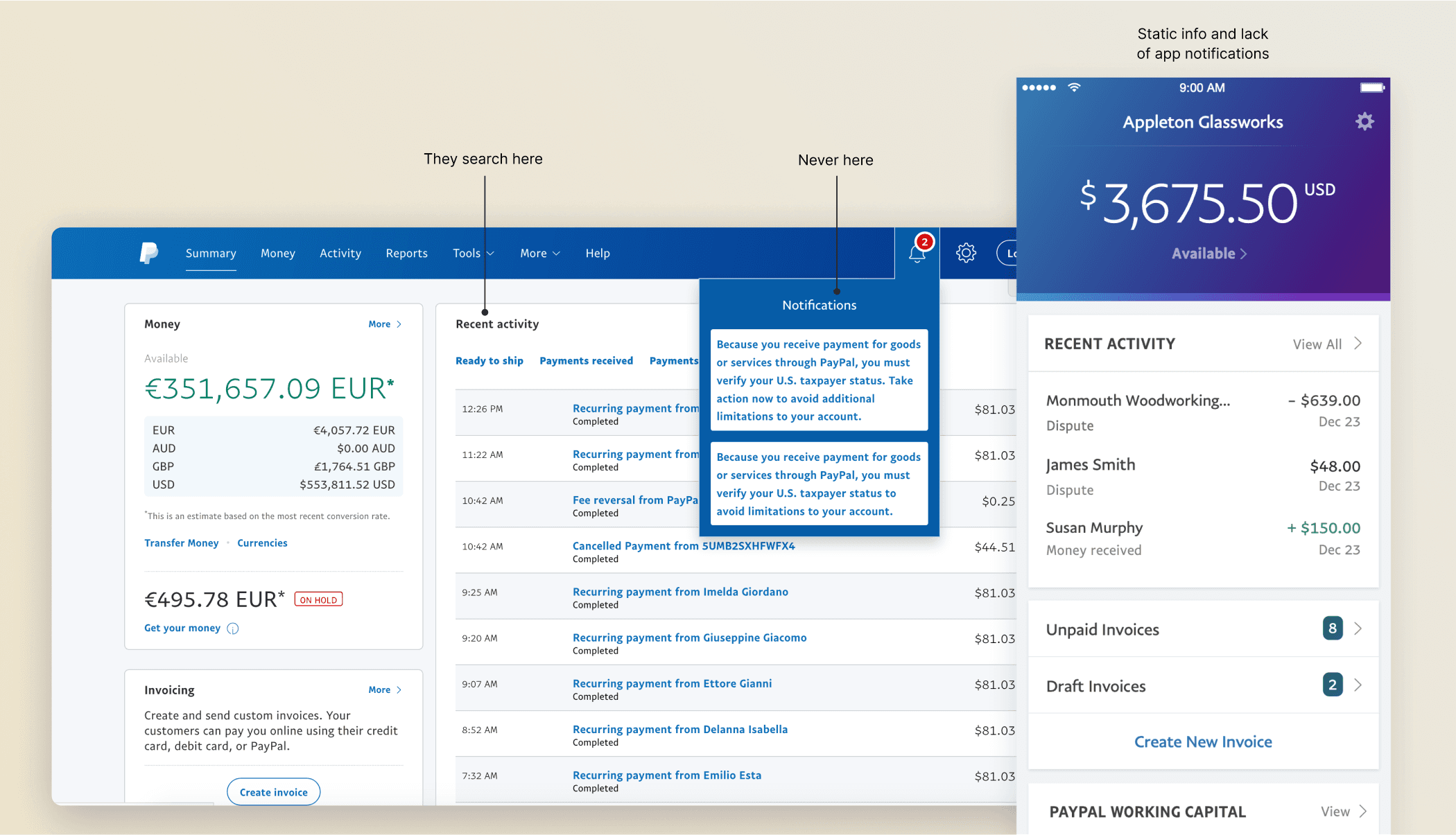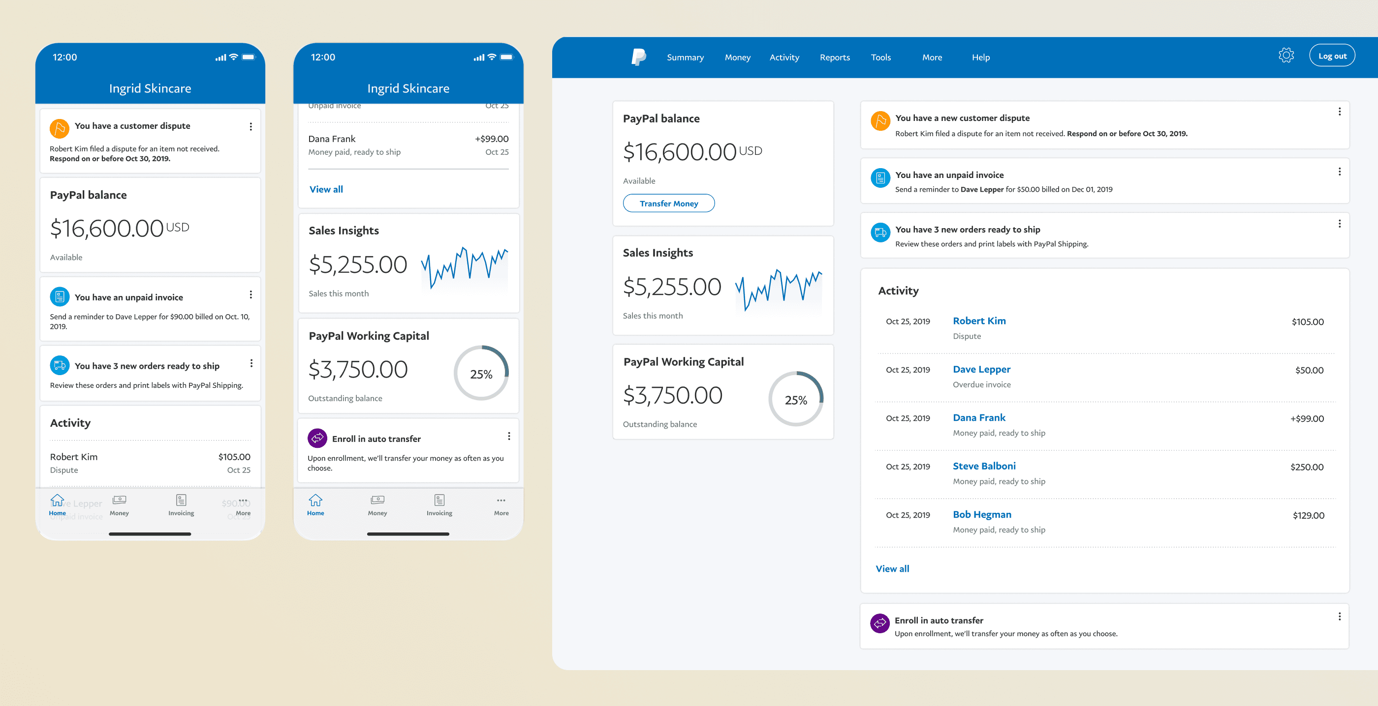 Merchants struggled to complete everyday tasks on PayPal — things like responding to disputes, creating invoices, or checking orders that need shipping. On the app, they could mostly just view info, not take action. On web, key details were scattered across transaction lists and notifications, making it tough to get anything done quickly.