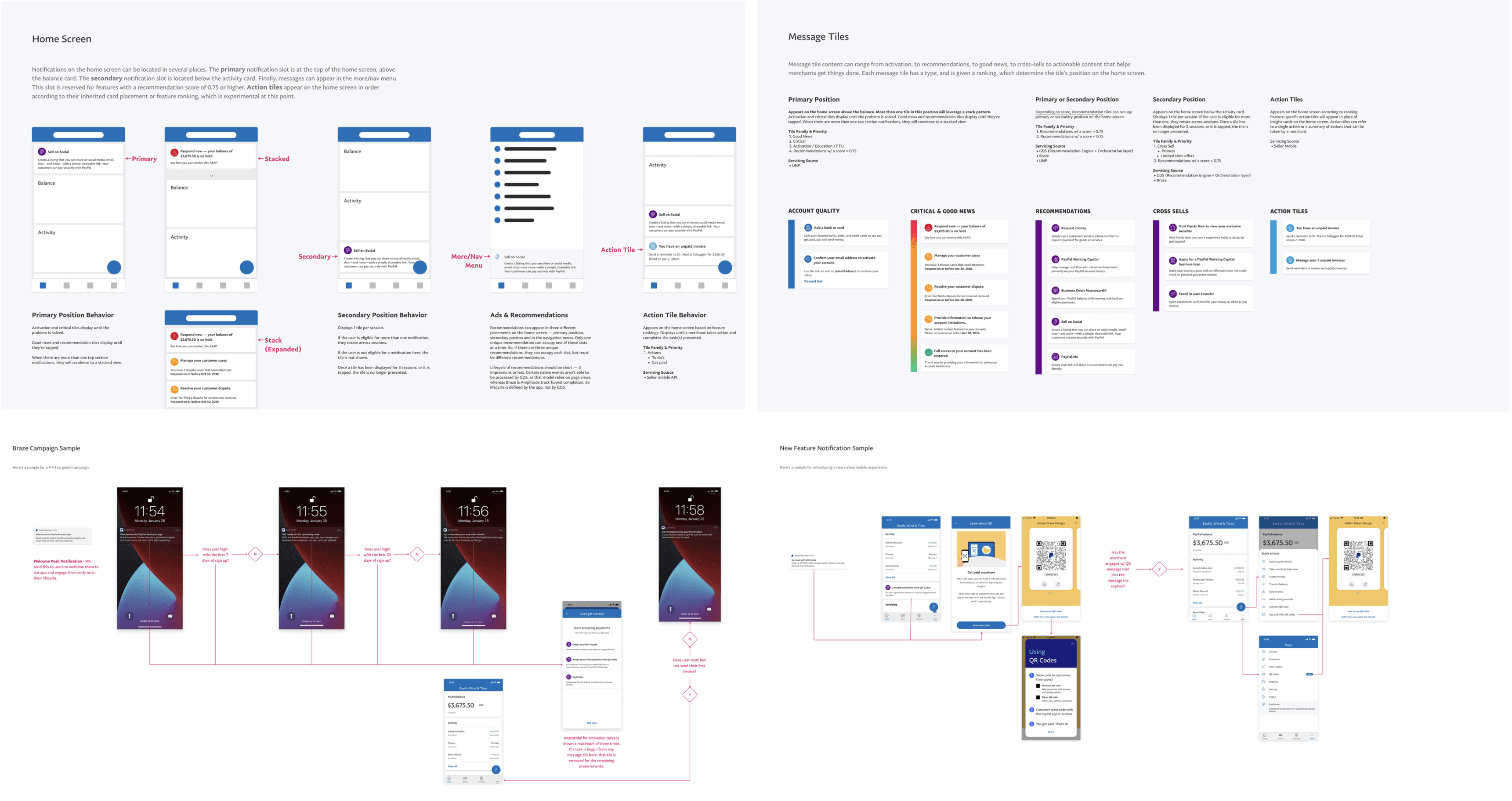 After wrapping up the concept phase, we moved into phase two: closing the gaps between mobile and web, and adding missing features and messaging on mobile. I collaborated with designers across the merchant org to understand their use cases, help translate them into our new design framework, and integrate their flows into the app. Here are some examples of in-app messaging across different communication types.