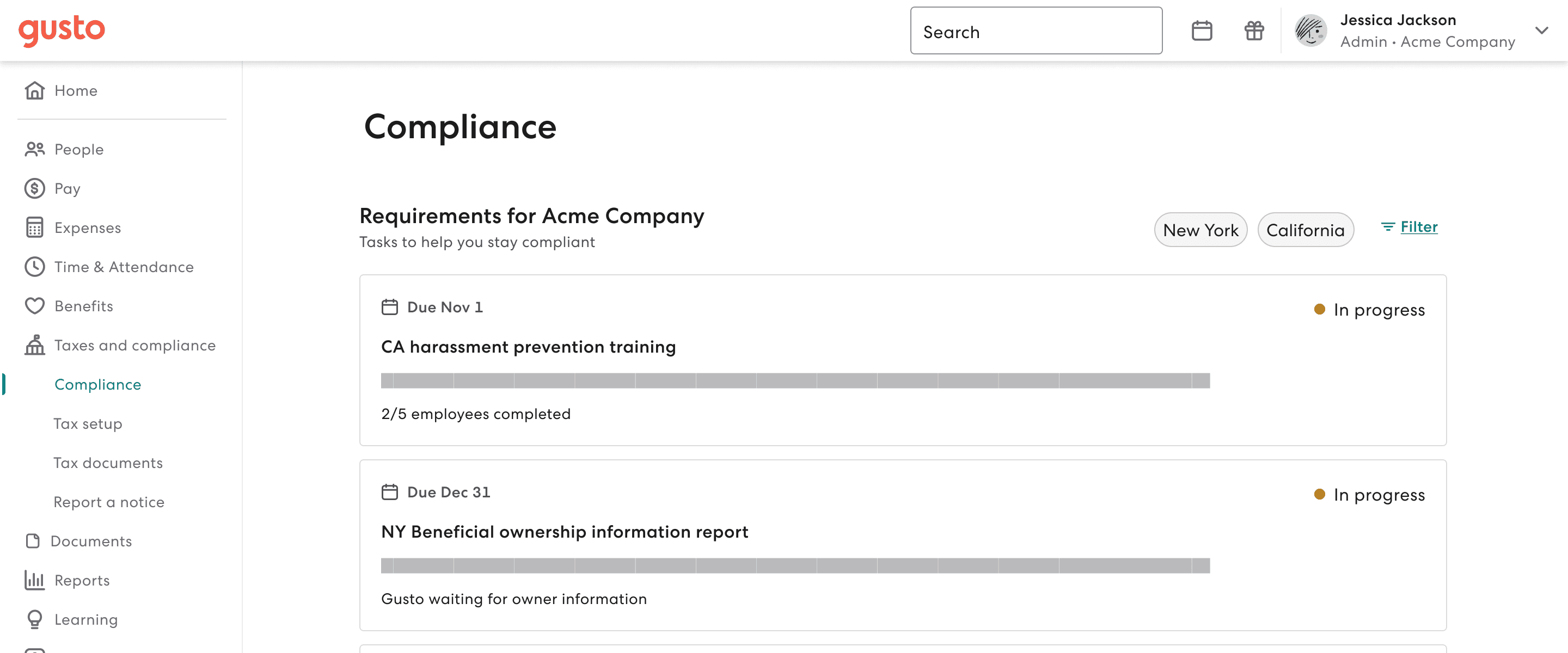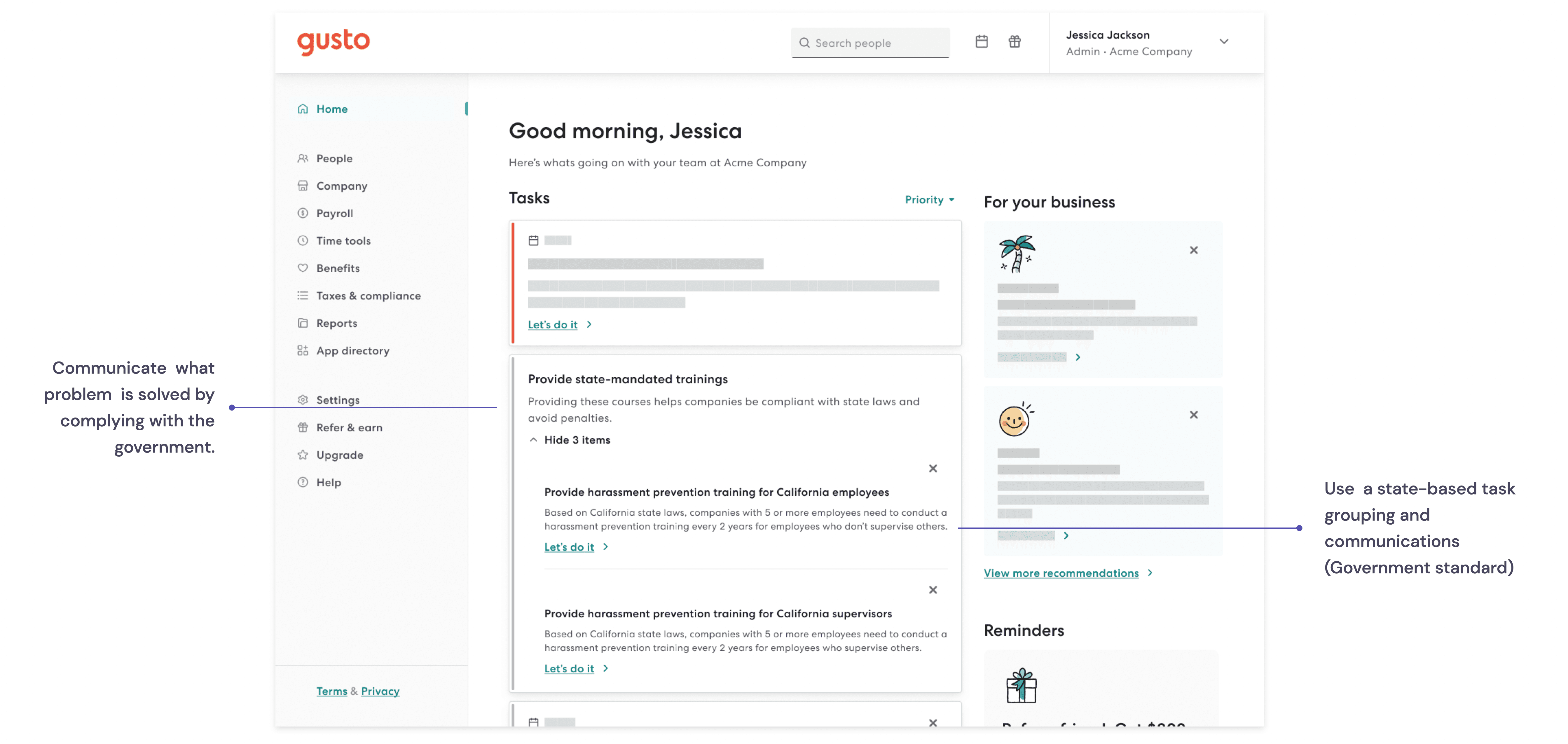 Some options were: Organizing compliance by type (payroll, HR, benefits, recurrently handled by Gusto) or by a combination of urgency and State, which is an industry standard we wanted to follow.