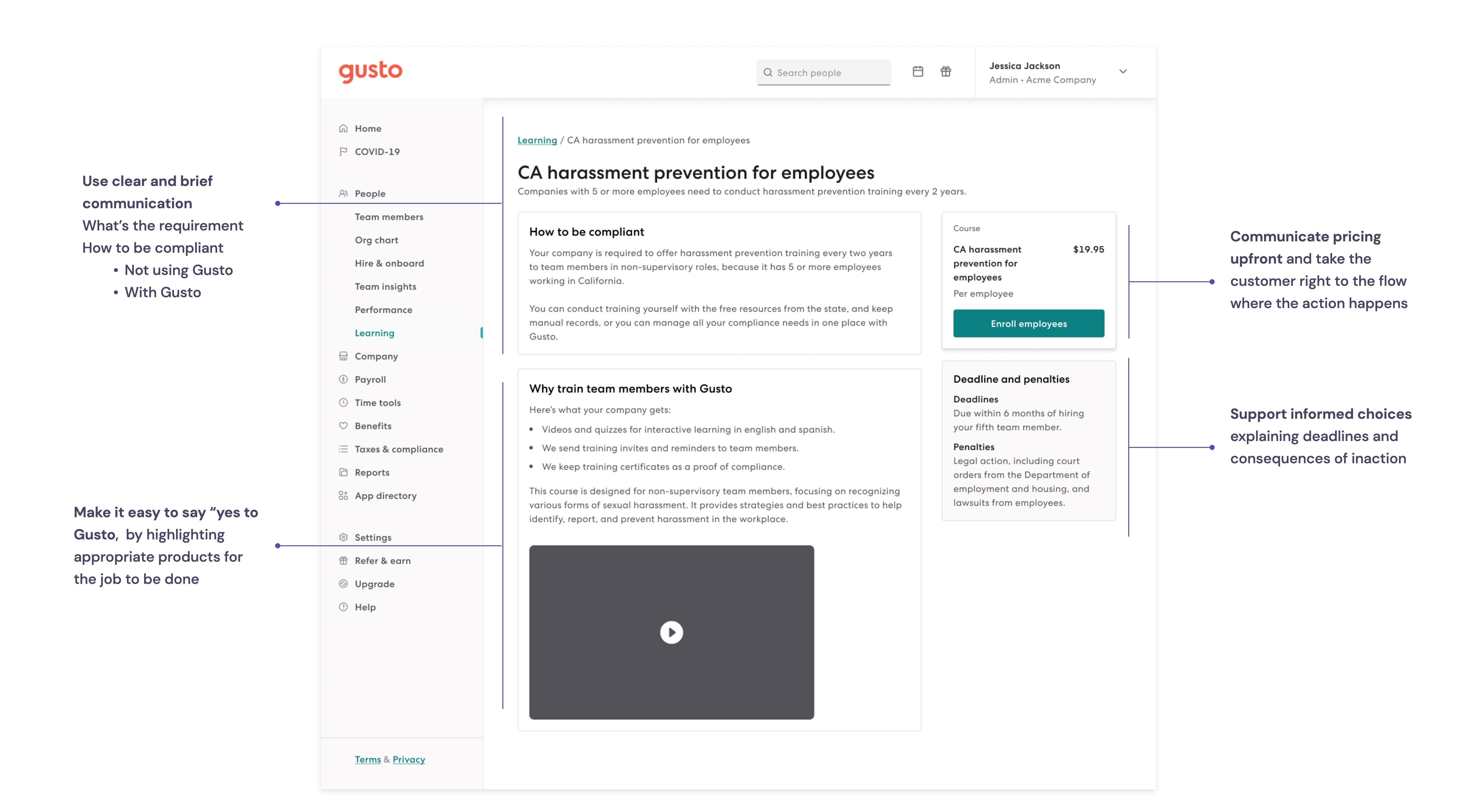 In the final flow, I prioritized a clear and safe experience, highlighting Gusto as the best solution to enroll employees in training. On the employee side, I put emphasis on using email and in-product notifications to remind employees to take trainings, helping companies be fully compliant.