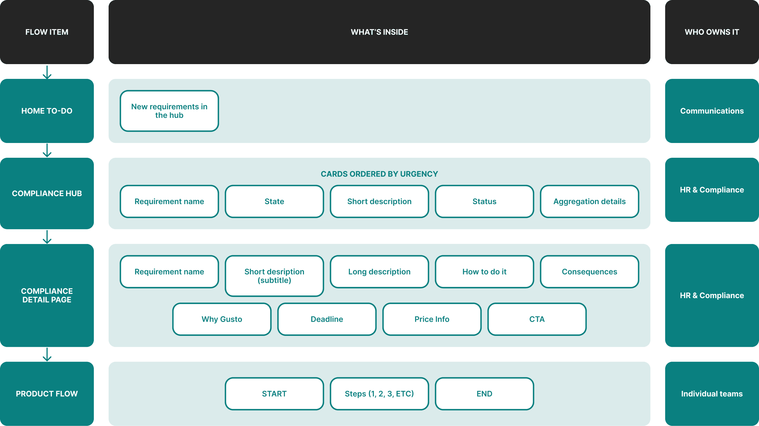Once key teams onboarded their compliance use cases into the new engine, we identified the need for a centralized hub to house requirements, avoiding overload in the Home task system. I mapped the information architecture and defined the informational pieces we needed to bring customers from a Home tasks to the hub, and into in-product flows for understanding and acting on compliance.