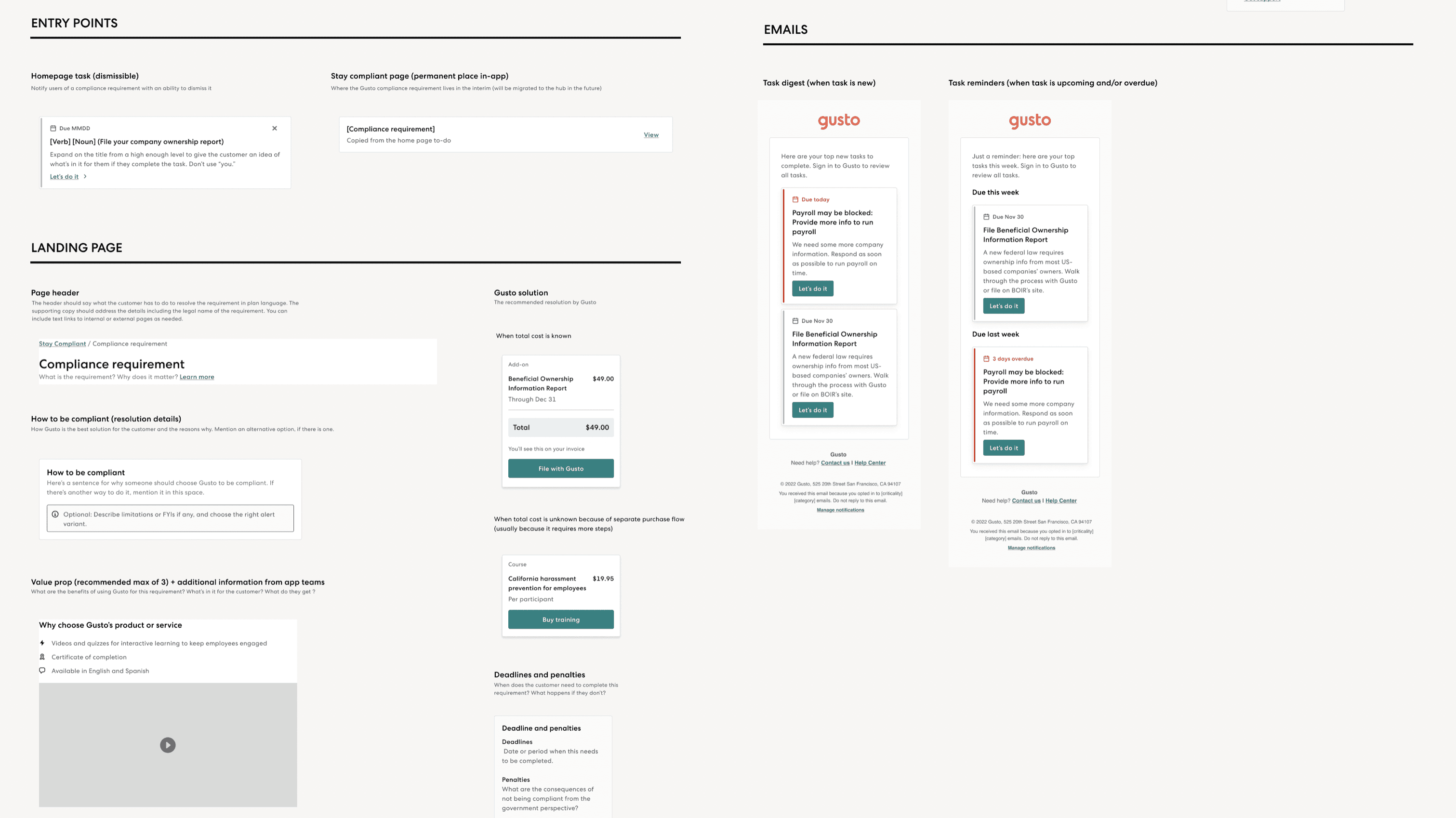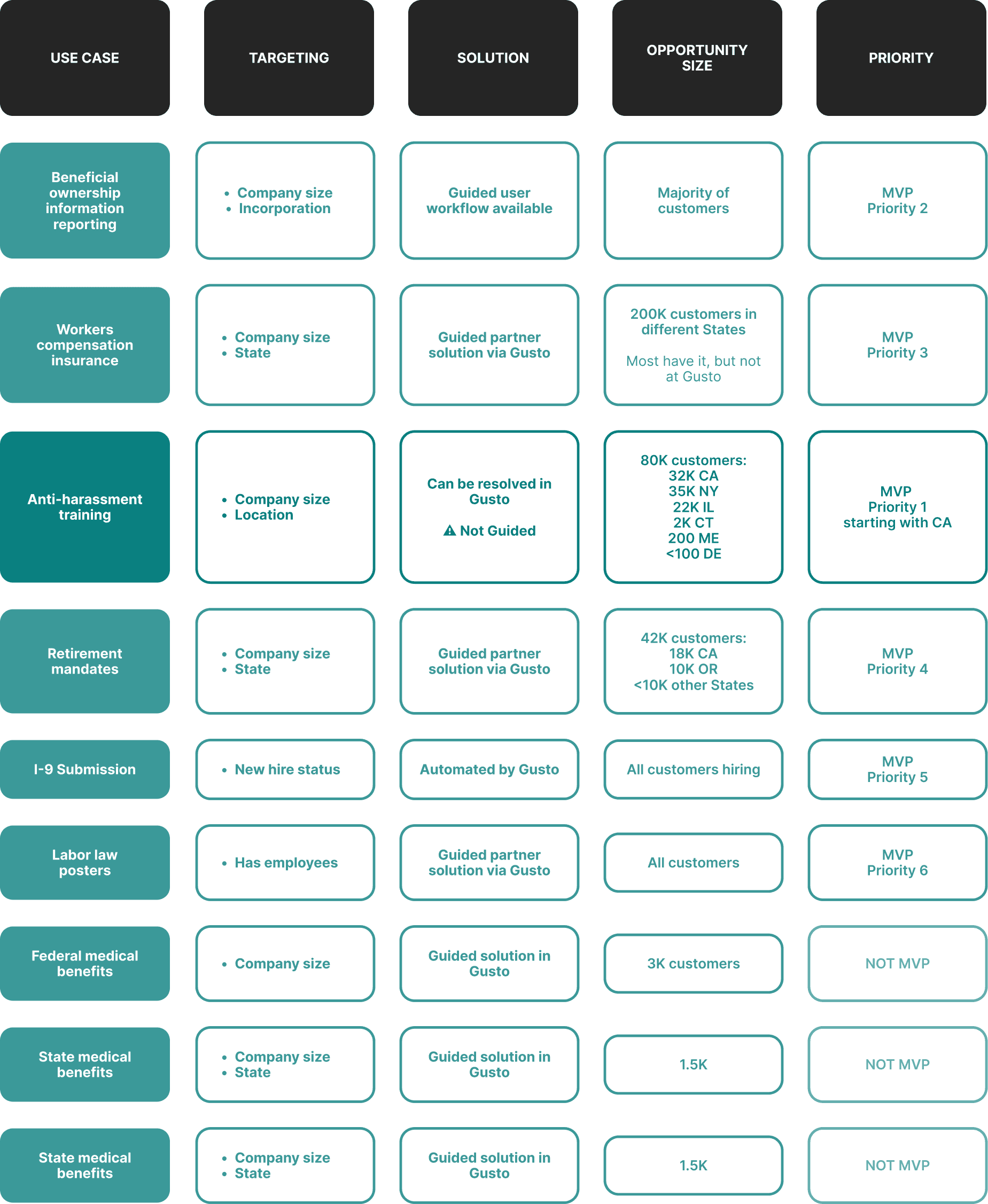 With my PM's input I mapped out the vast arrange of use cases we had to tackle. We decided to start with compliance trainings in California, due to its opportunity size, complexity and Gusto's full control over the experience.
