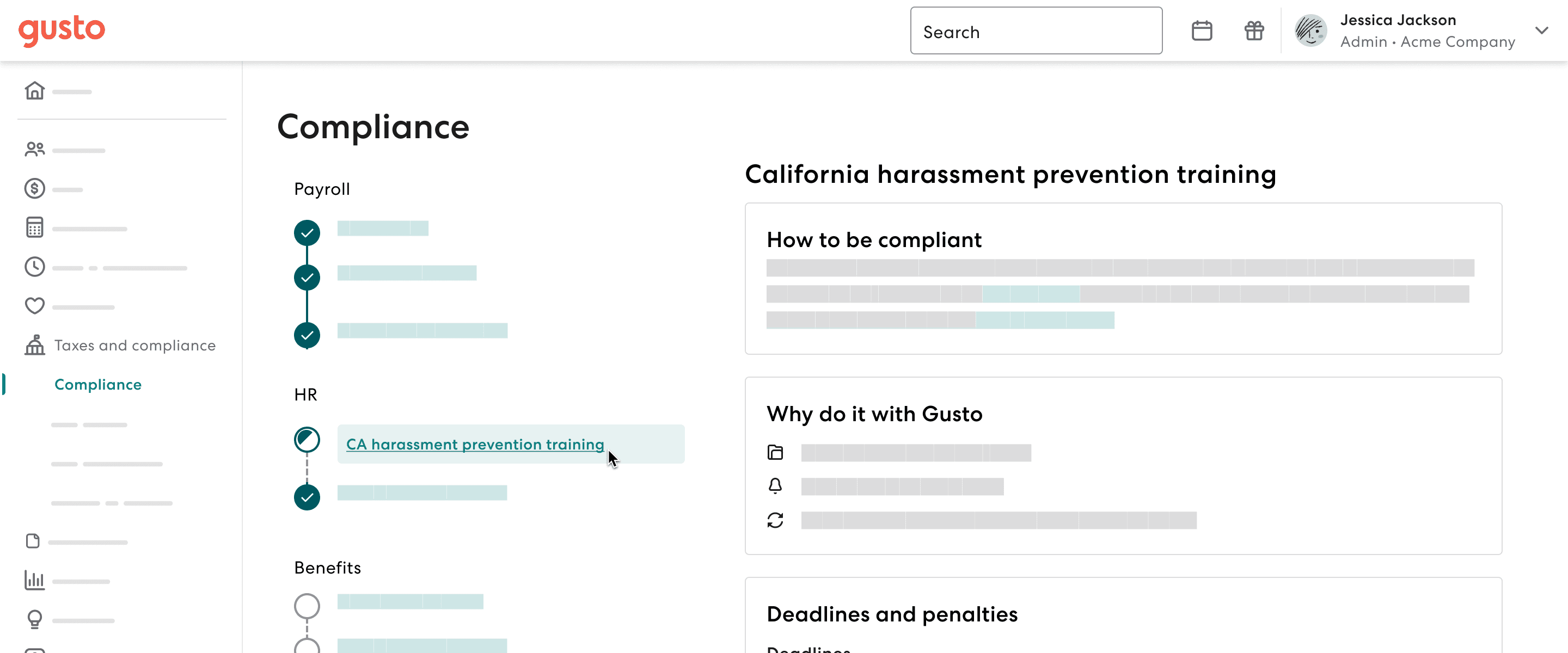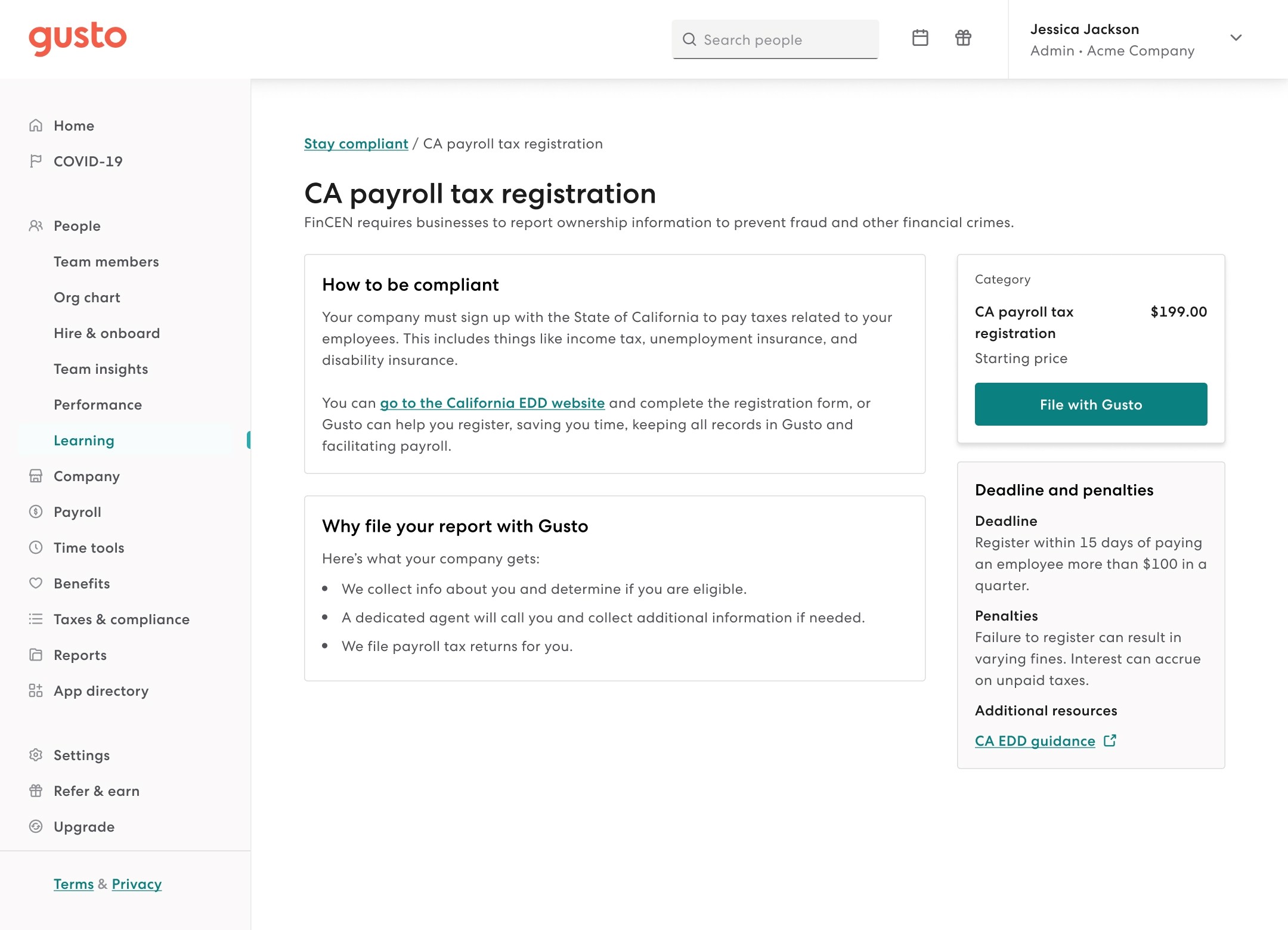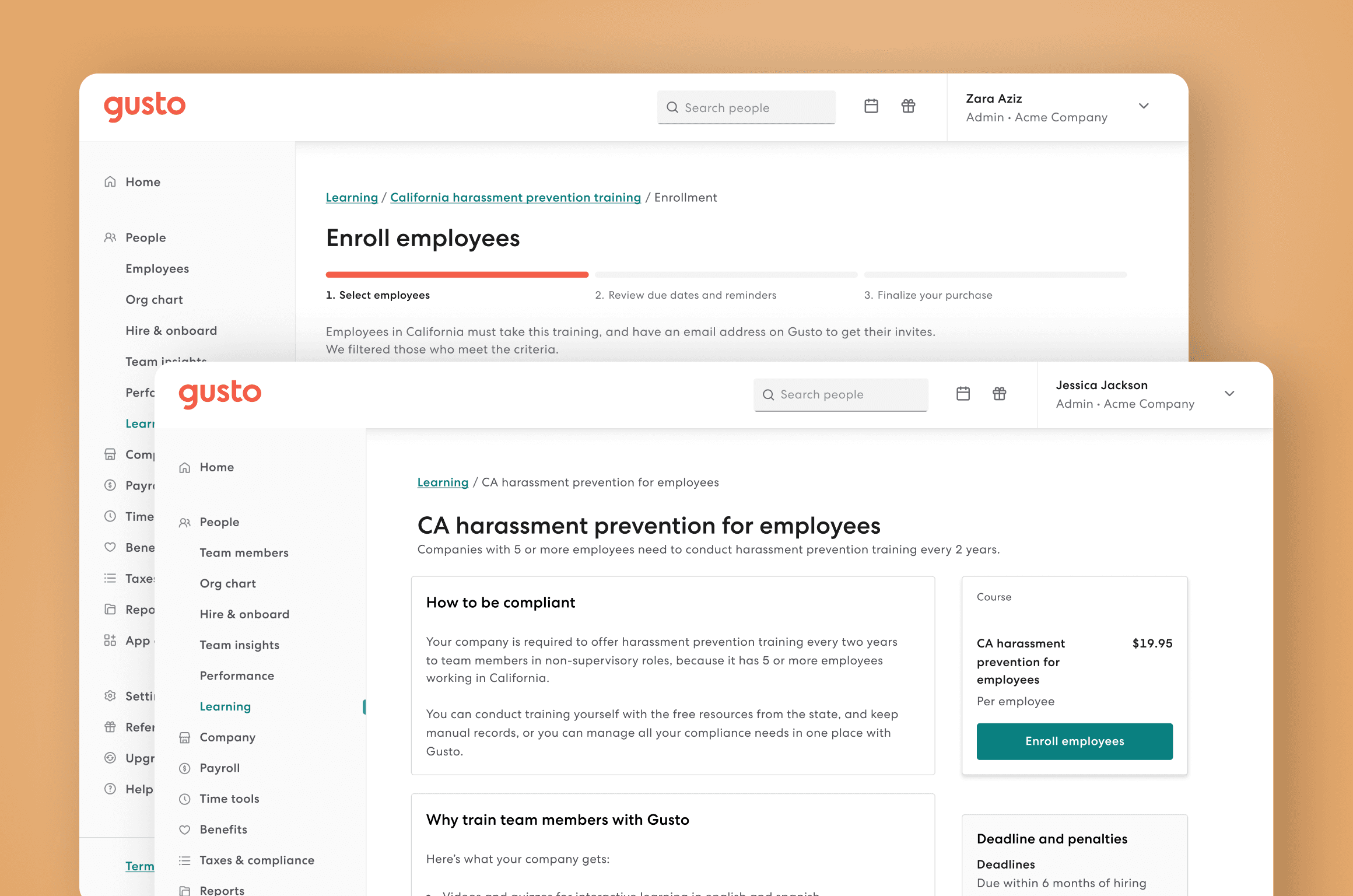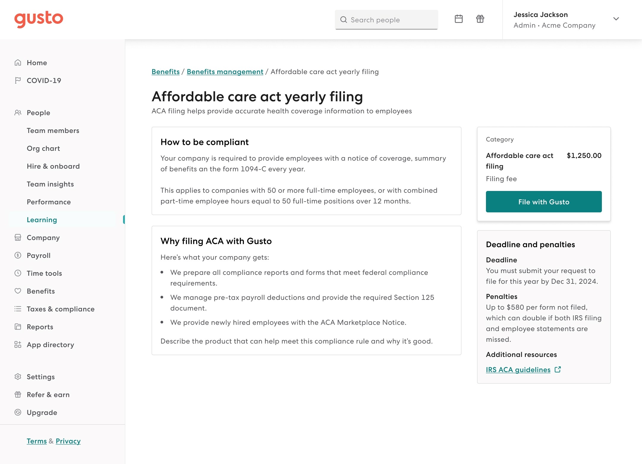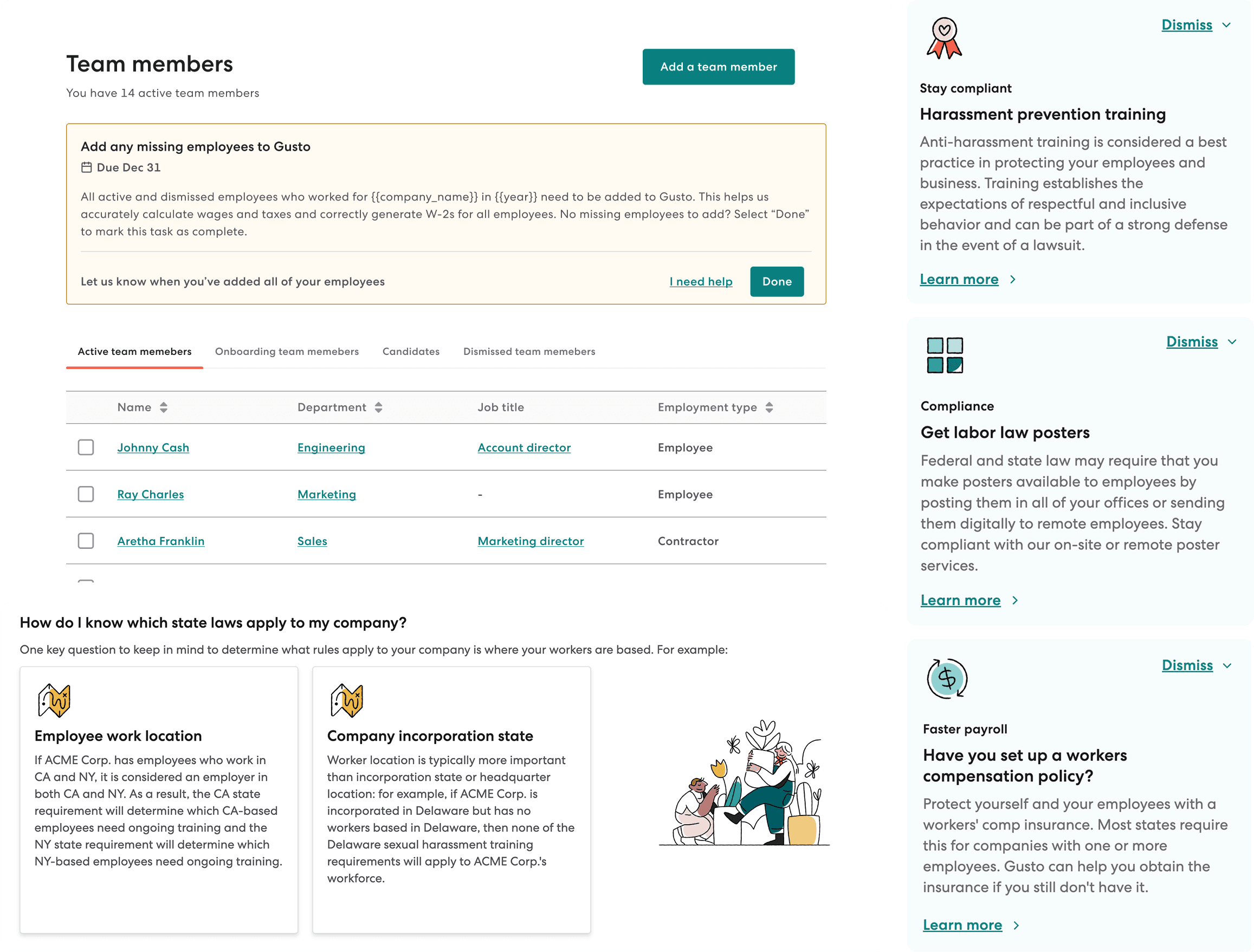 The compliance engine is now a shared infrastructure, used across Gusto to power HR, payroll, and benefits compliance alerts and changes.It inspired adoption of compliance UX principles company-wide, and brought a constant stream of revenue to multiple Gusto products and partners (HR trainings, law posters, benefits and insurance providers).